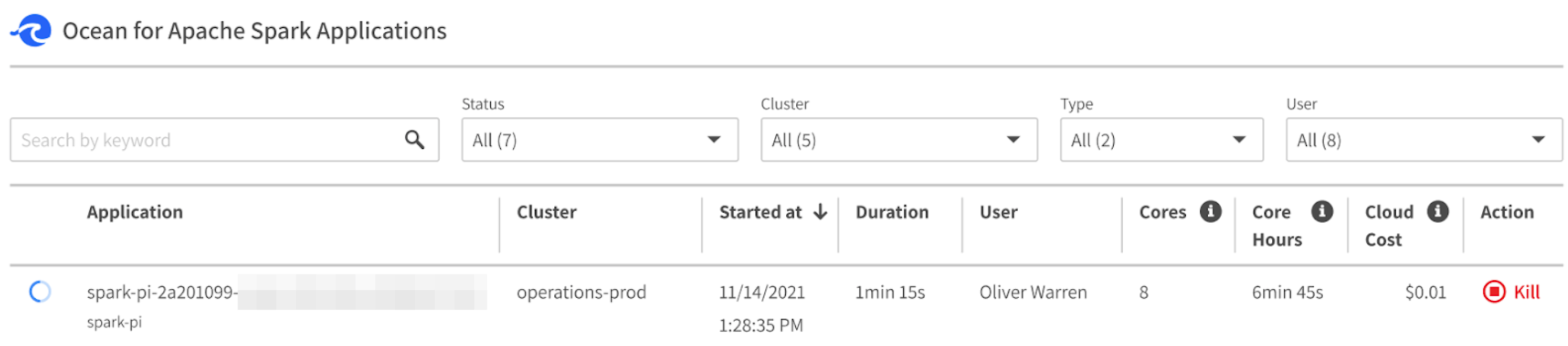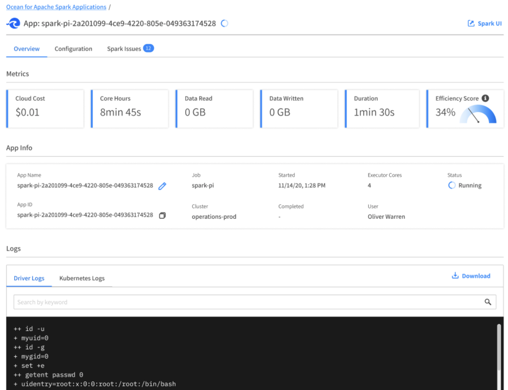 • We assign the job ID "spark-pi" to the application. A job is a logical grouping of applications. It is typically a scheduled workload that runs every day or every hour. Every run of a job is called an application in Ocean Spark. In the console, the Jobs view lets you track performance of jobs over time. A unique app ID will be generated from the job ID (although you can specify one yourself).